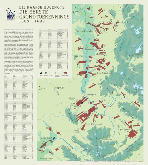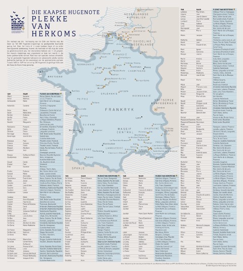 In 1692 was daar 'n totaal van 201 Franse Hugenote aan die Kaap die Goeie Hoop. Die meeste van hulle is gevestig in Franschhoek 70 km buite Kaapstad, waar baie van die plase nogsteeds hul oorspronklike Franse naam dra.