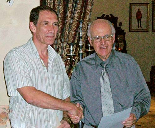 | | Prizes were also presented. Here Johan Janse van Rensburg hands the Merit Award to Pieter de Jager, a cattle farmer from Ottosdal and member of the North West Branch. |