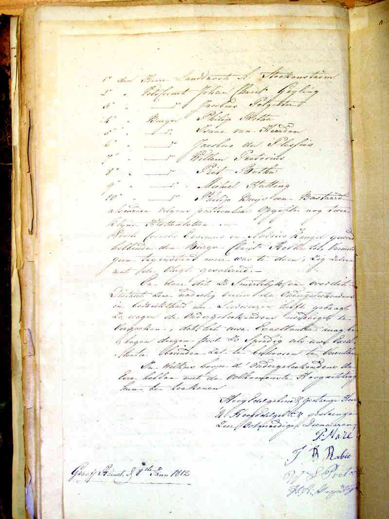 1. den Heere Landdrost A. Stockenstròm alsmeede volgens particuliere opgifte nog twee Voorts Cornelis Erasmus en Andries Krugel gewond En daar dit zo Smertelijk, en voor dit In welkens hoope d'ondergeteekendens de Hoog Edelgeboore &[tc] gestrenge Heer | Landdrost And: Stockenstrom " ------------ Piet Botha and according to private acc[oun]ts 2 young This to us so afflicting and for the District In this hope we have the honour P. Maré Graaf Reinet, |